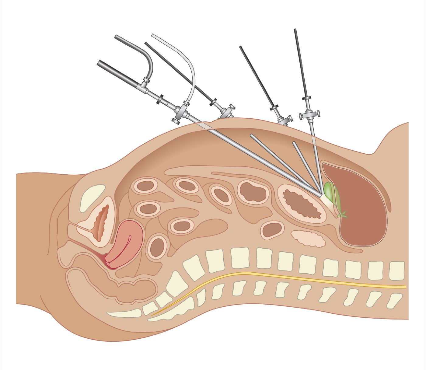 Για την πραγματοποίηση των χειρουργικών χειρισμών χρησιμοποιούνται εξειδικευμένα λαπαροσκοπικά εργαλία τα οποία είναι λεπτά και έχουν ικανό μήκος ώστε να μπορούν να εισέλθουν στην κοιλιά και ο χειρουργός να μπορεί να τα χειριστεί απ' έξω. Όλα τα εργαλεία και το λαπαροσκόπιο εισέρχονται στη κοιλιά μέσω οδηγών που ονομάζονται Trocar και τα οποία επιτρέπουν τη σταθεροποίηση των εργαλείων και την ευχέρια στους χειρισμούς ενώ, με ειδικές βαλβίδες ελέγχουν την απώλεια του αερίου που έχει χρησιμοποιηθεί για να "φουσκωθεί" η κολιά.