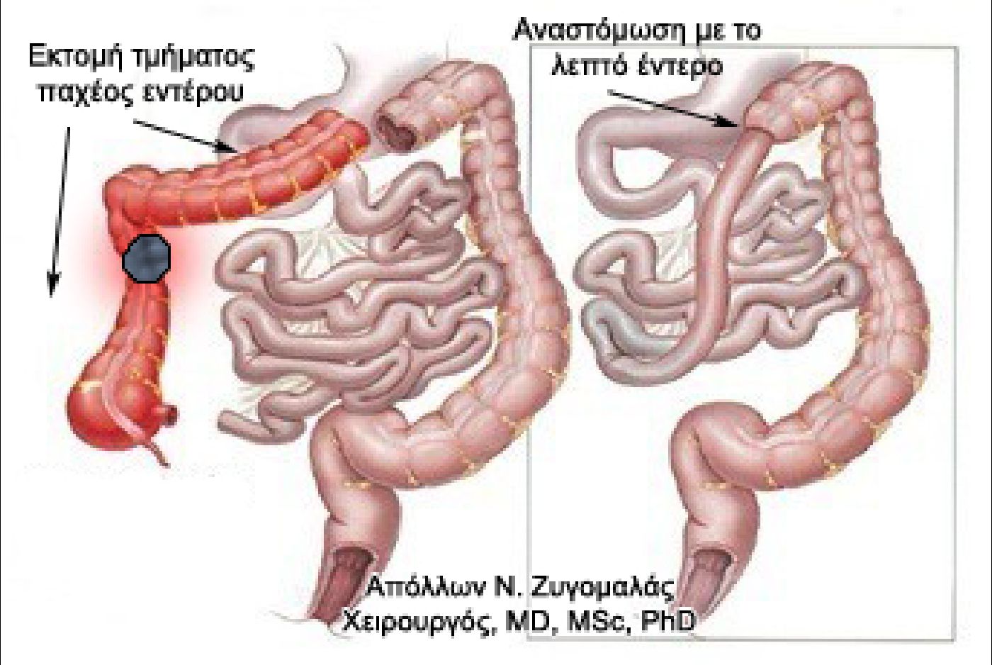 Η επέμβαση για την αφαίρεση του τμήματος του παχέος εντέρου που πάσχει ονομάζεται κολεκτομή. Ανάλογα με το τμήμα του εντέρου που αφαιρείτε χωρίζεται σε Δεξιά, Αριστερή, Σιγμοειδεκτομή , Χαμηλή πρόσθια (αφαίρεση τμήματος του ορθού και του σιγμοειδούς κόλου) και Κοιλιοπερινεϊκή (αφαίρεση του ορθού μαζί με τον πρωκτό και δημιουργία μόνιμής παρά φύση έδρας).
