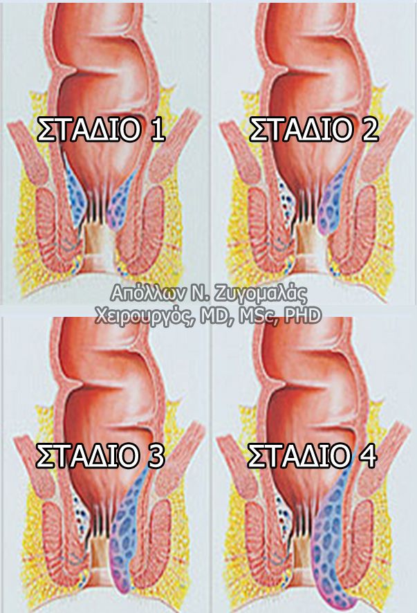 Οι παθολογικές εσωτερικές αιμορροΐδες υποδιαιρούνται σε 4 στάδια: